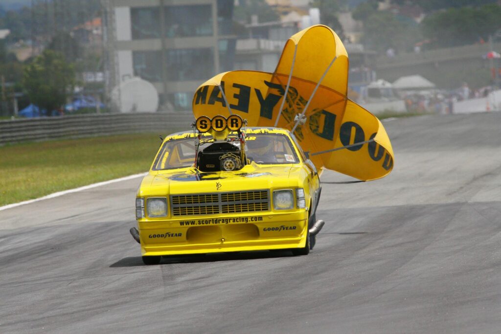 O veículo conta ainda com apoio de dois paraquedas, pois só o freio não segura. São mais de 300 km/h do zero aos 400 metros. É muito rápido. Tem de estar bem preparado e bem assistido para a frenagem. A pista também precisa ter uma área de escape, para que a apresentação tenha a melhor performance possível.